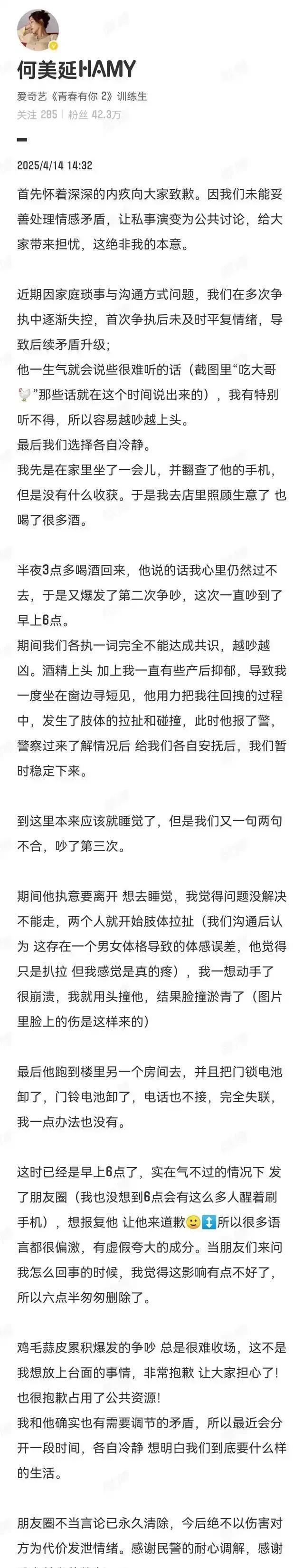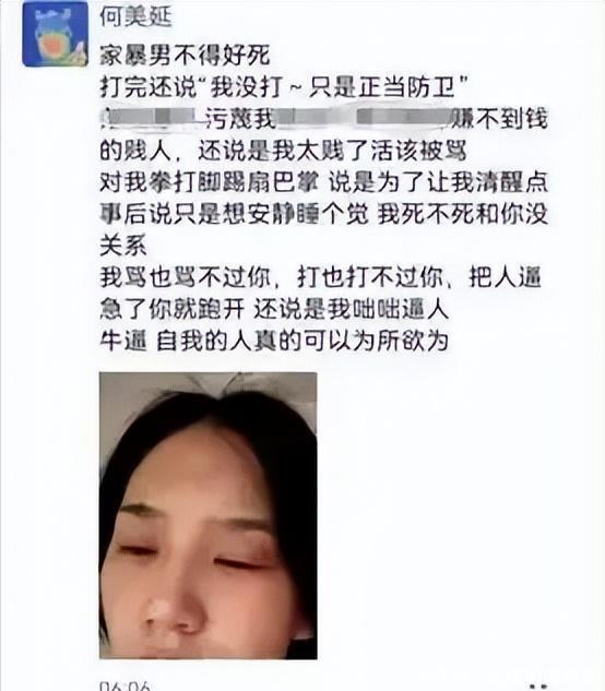 视频中的梁淞,言语中充满了无奈、落寞和迷茫。 我看很多网友之前评论梁淞演技太好,或者说他说的跟做的完全对不上,但说实在的,现在断粮就是事实,一家七口人,要是梁淞的事业再没有起色,真的很难了。 02. / 梁淞现在事业没起色,之前很多人说别老怪何美延,自己没能力嘛,怪老婆算个啥本事。 我起初真的没太关注这一对,看了一眼俩人吵架,真的就像两个小孩在闹脾气,没有逻辑无厘头的很。 但这一期背后真正的本质浮现出来了。 起因就是今年4月,俩人发生激烈争吵后,还有些肢体冲突,导致何美延额头撞伤,而梁淞独自离开想睡觉,却把门反锁了。而何美延气未消,砸门也不开,最后发出了当时那条朋友圈,指控梁淞家暴+骚聊。