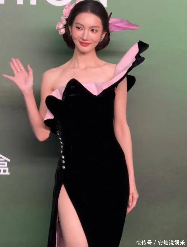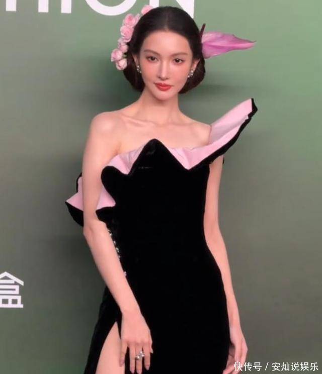 金晨的打扮,算是这次红毯上少数几个比较成功的。这次盛典的主题是“花”,她的衣服就特别贴合这个主题。她穿的裙子是两层的,里面是粉色的,外面罩了一层黑色的纱,粉色代表了花的娇嫩,黑色又显得很高级,既切合了主题,又不会显得太俗气。更巧的是,她盘起来的头发上还别了三朵白色的小花,跟头发缠在一起,特别自然。她往那一站,真就像个花仙子一样,很清新,很有气质,是现场少有的穿对了衣服的明星。